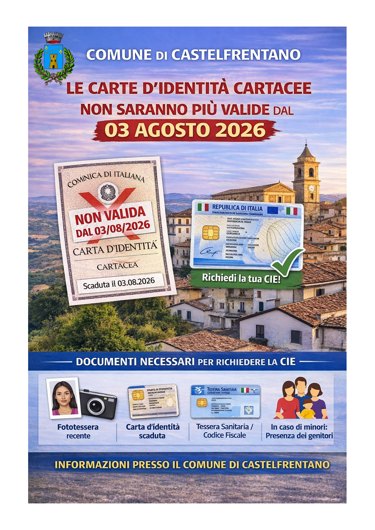 Per effetto del Regolamento Europeo 2019/1157, che ha stabilito i requisiti minimi di sicurezza dei documenti rilasciati dagli Stati membri, le carte d’identità in formato cartaceo perdono la loro efficacia dal 03 Agosto 2026.