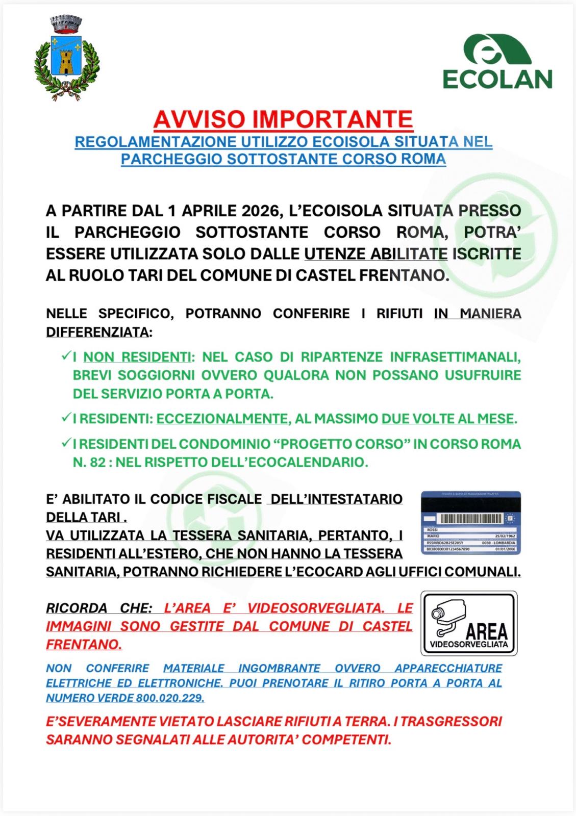 l’ecoisola situata nel parcheggio sottostante Corso Roma sarà accessibile esclusivamente alle utenze abilitate iscritte al ruolo TARI del Comune di Castel Frentano.